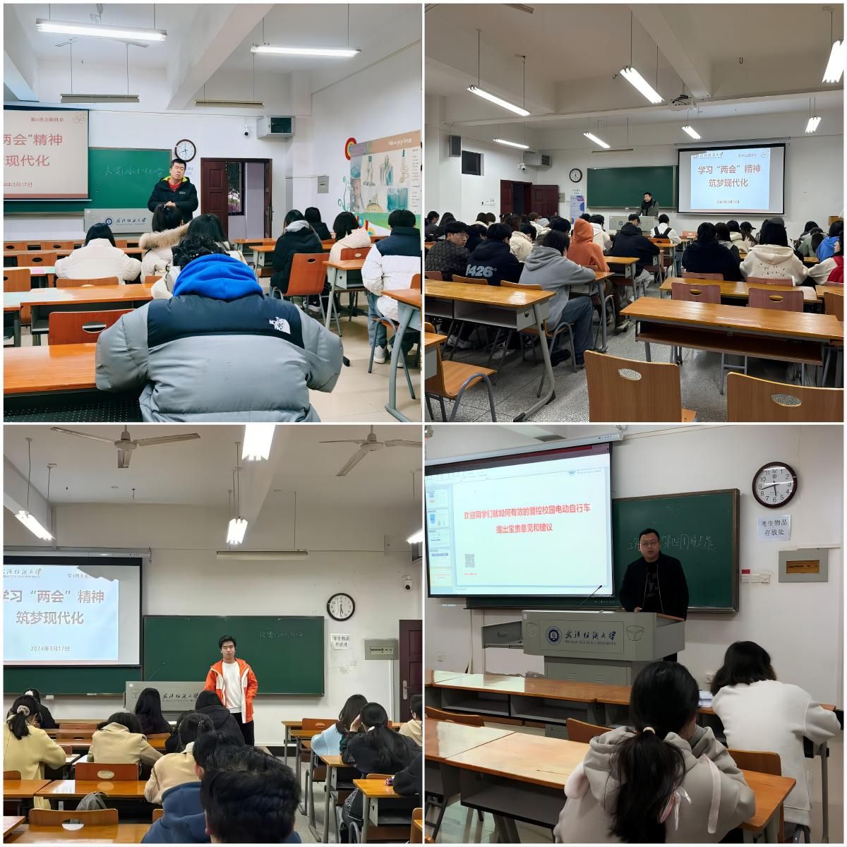 班会详细学习了两会中提到的新质生产力、新三样、 宏观政策取向一致性等12个新词热词,这些词语体现了国家发展的蓬勃生命力和强劲动力;了解了2023年关于教育领域的“关键数据”,让大家感受到国家对于教育的重视,也是教育强国建设的生动写照;倪闽景、董明珠、宋宝安等代表委员关注毕业生就业问题,纷纷建言献策,助力学生就业;中国工程院院士、校长徐卫林作为全国人大代表,提出了“建议选派高校教师到中小学担任科普及创新导师”“加大纺织科技研发投入,破解高质量发展的难点堵点”“马面裙等传统服饰走红,现代纺织业提供支持”等建议,发出了响亮的纺大声音,让同学们倍感自豪和骄傲。班会最后针对防范电信诈骗、电动车安全等进行了再次强调,持续增强学生的安全意识。