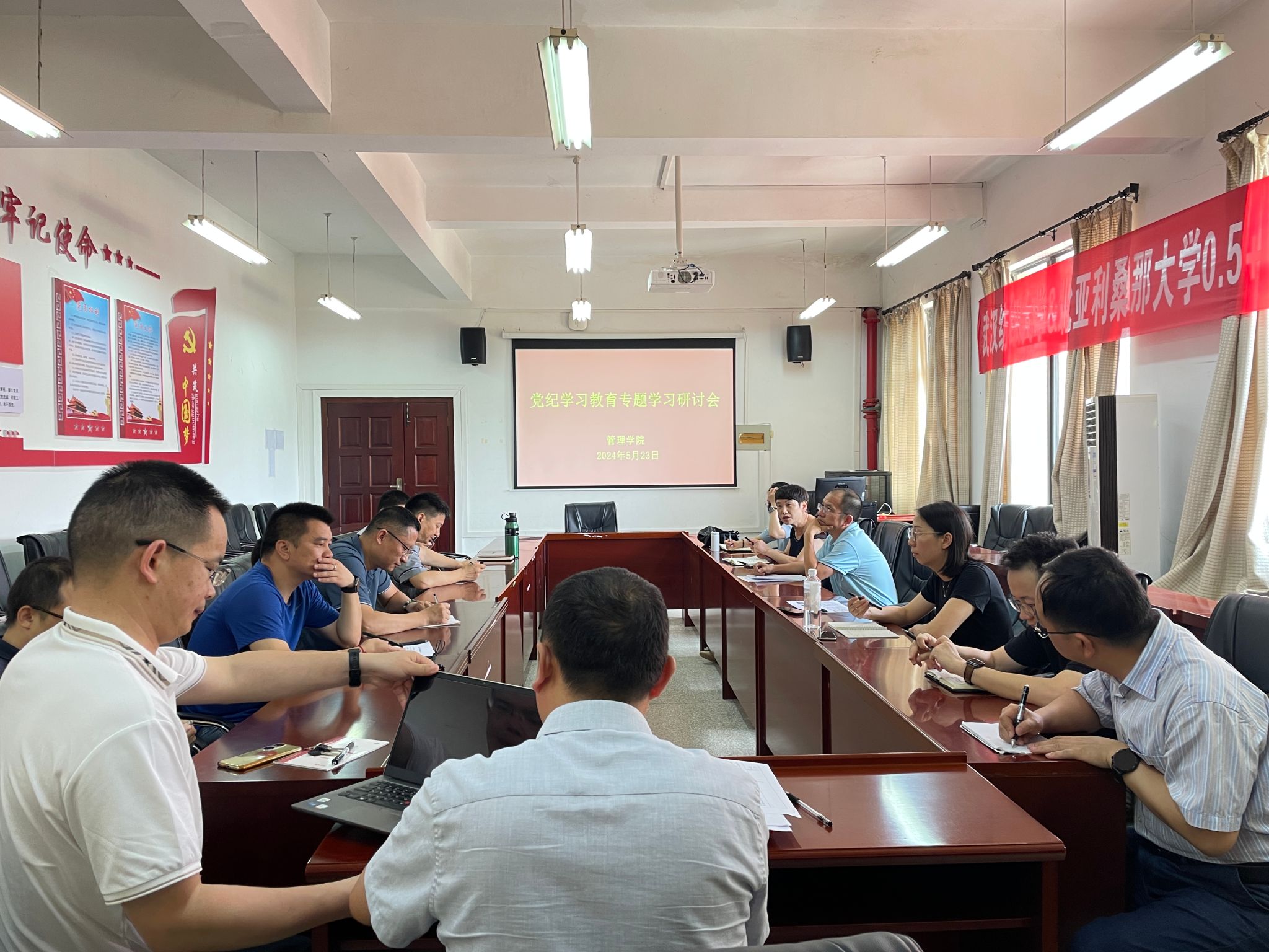 为推动党纪学习教育走向深入,5月30日下午,yabo888vip网页版登录召开党纪学习教育专题班,学院党委委员、系(中心、办)主任、党支部书记参会。学院党委书记滕胜娟以《锤炼党性修养 强化责任担当 护航学院发展》为题,做辅导报告。