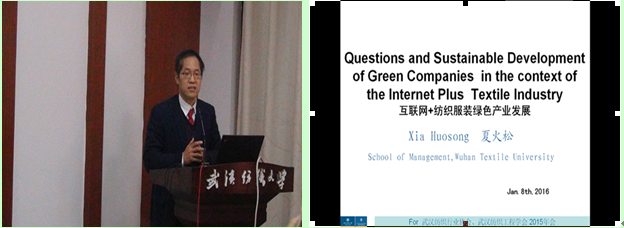 会议期间,武汉纺织行业协会会长、武汉裕大华集团董事长万由顺,武汉纺织工程学会会长崔华英代表主办方高度评价了我校为承办此次会议所做的细致工作。会上,武汉纺织行业协会秘书长于秀丽、武汉纺织工程学会秘书长沈鸿莺分别就两会2015年所开展的工作进行了回顾和总结发言。同时,会议审议通过了常务理事长人选。我校yabo888vip网页版登录夏火松教授在论坛上作了“互联网+纺织服装绿色产业发展”的主题演讲,获得了与会代表的强烈共鸣。