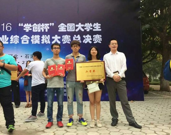9月25日,2016“学创杯”年全国大学生创业综合模拟大赛全国国赛在河北经贸大学隆重举办。国家级实验教学示范中心联席会经管学科组主办的2016“学创杯”全国大学生创业综合模拟大赛决赛暨颁奖典礼在河北经贸大学落下帷幕。经过激烈角逐,我校yabo888vip网页版登录罗建军老师指导的“青柠队”(团队成员:李雅辉、李甲川、韩丰玲)荣获全国总决赛二等奖。