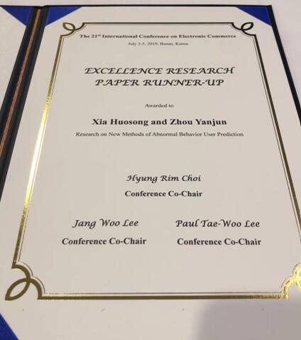 ICEC电子商务国际会议自1998年召开以来,在全世界主办了21次,该会议是一个非营利性的科学组织,旨在为电子商务及相关领域的研究人员和从业人员提供知识交流平台与合作的机会。本次会议的投稿接近200篇左右,会议对论文进行了评选和颁奖,其中优秀论文奖3篇,创新论文奖3篇。夏火松和周彦君的论文《Research on New Methods of Abnormal Behavior User Prediction》获得了优秀论文奖。夏火松团队参加此会议并在会议上作学术报告,有助于参会人员及时了解、掌握电子商务领域的前沿现状,同时对提高我校在国内外的影响力做出了贡献。