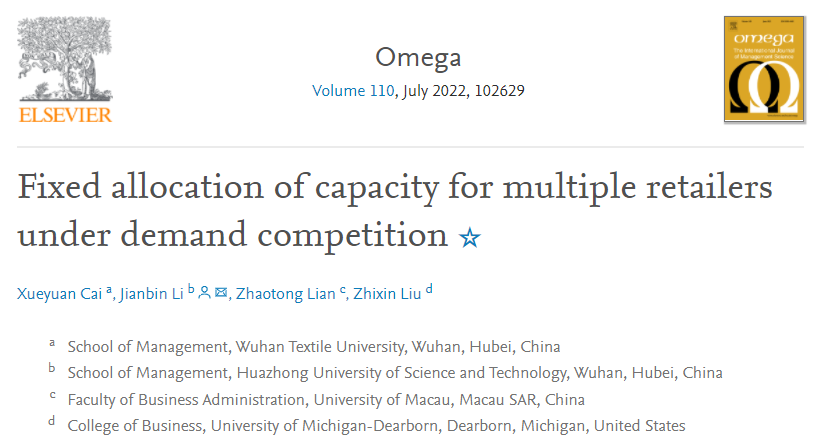 3月2日,运筹学与管理科学领域国际一流期刊《Omega》(SCI/SSCI, 影响因子7.084,中科院1区)在线发表我校yabo888vip网页版登录蔡学媛副教授在库存管理领域取得的重要进展:需求竞争下面向多个零售商的产能固定分配机制—Fixed Allocation of Capacity for Multiple Retailers under Demand Competition”。文章DOI:https://doi.org/10.1016/j.omega.2022.102629。我校为该论文的第一作者单位。
