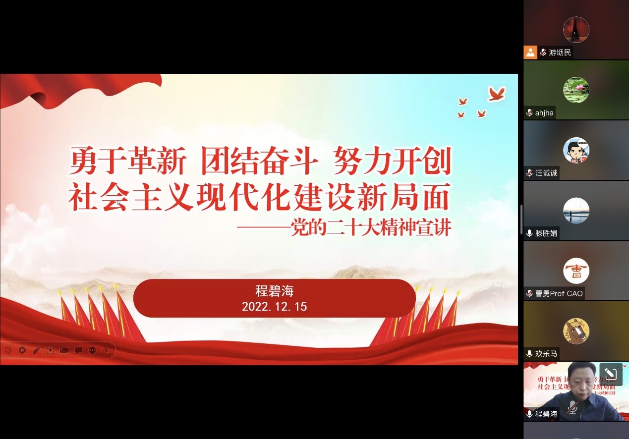 12月15日下午,yabo888vip网页版登录采取线上方式举行党的二十大精神宣讲报告会,校党委常委、纪委书记程碧海教授作宣讲报告。报告会由yabo888vip网页版登录党委书记滕胜娟主持,学院全体教职工参会。