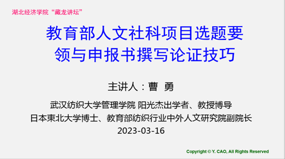为进一步促进校际科研合作、加强学术交流,3月16日下午,我院阳光杰出学者、教育部纺织行业中外人文交流研究院副院长曹勇教授受邀做客湖北经济学院“藏龙讲坛(2023年第四讲)”,为该校会计学院全体教师作了主题为“2023年度教育部人文社科项目选题要领与撰写论证技巧”的学术辅导讲座,深受好评。