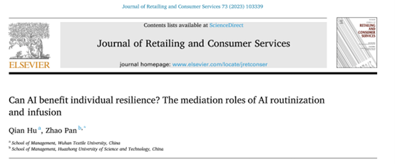 胡倩在国际管理学领域主流高水平期刊《Journal of Retailing and Consumer Services》发表在智联网环境下服务模式创新的理论与方法研究领域取得的重要成果:“Can AI benefit individual resilience? The mediation roles of AI routinization and infusion”。文章DOI: 10.1016/j.jretconser.2023.103339。yabo888vip网页版登录为该论文的第一作者单位。