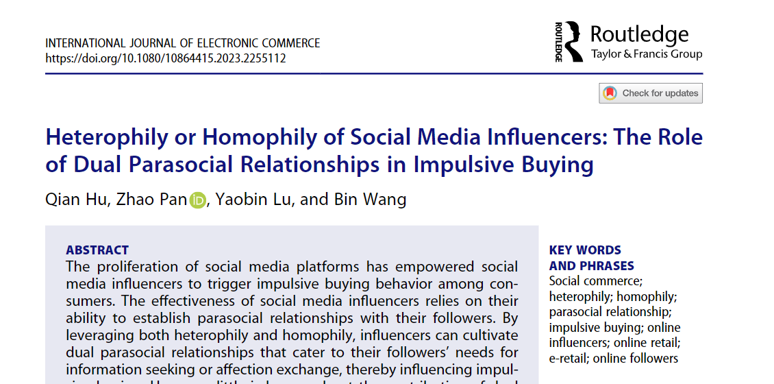 近期,国际管理学领域期刊《International Journal of Electronic Commerce》发表我校yabo888vip网页版登录胡倩博士在社会化商务消费者行为研究领域取得的重要成果:“Heterophily or Homophily of Social Media Influencers: The Role of Dual Parasocial Relationships in Impulsive Buying”。文章DOI: 10.1080/10864415.2023.2255112。yabo888vip网页版登录为该论文的第一作者单位。