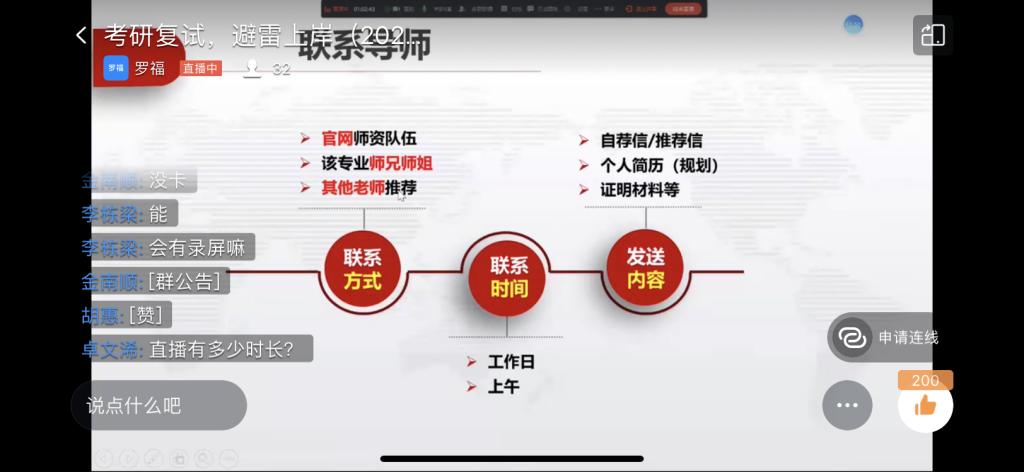 3月7日上午,yabo888vip网页版登录在钉钉平台开展朋辈领航考研复试讲座,本次讲座邀请到yabo888vip网页版登录研究生校友罗福担任此次讲座的主讲人。近三百余名大二、大三、大四同学线上聆听。