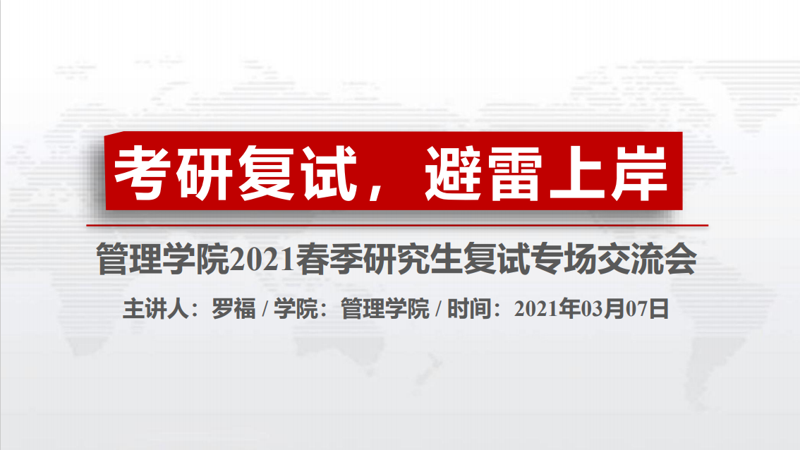 本次交流会围绕如何准备复试各环节,如何联系导师,如何搜集调剂信息等考研复试所要注意的流程与事项进行展开。罗福讲述了“复试是考研的重要阶段”,并指出初试成绩只是复试的基础,并不能决定考研的结果,明确提出了复试的重要性。接着,罗福为大家讲解了备考笔试和面试都该如何复习,并强调前期准备工作应该充分,把握好大四的寒假这个关键时期,搜集复试科目真题进行研究学习,并着重强调了英语口语的复习。随后,罗福向大家介绍了联系导师的邮件该如何书写,对自荐信应注意的问题进行了细致讲解。同时,罗福分享了6个获取调剂信息的渠道,并讲解了调剂“地区、院校、系统操作”的选择和操作问题。最后,罗福以寄语作结,他以幽默又有内涵的讲述方式告诫学子们要加强自控能力,劳逸结合,努力拼搏。